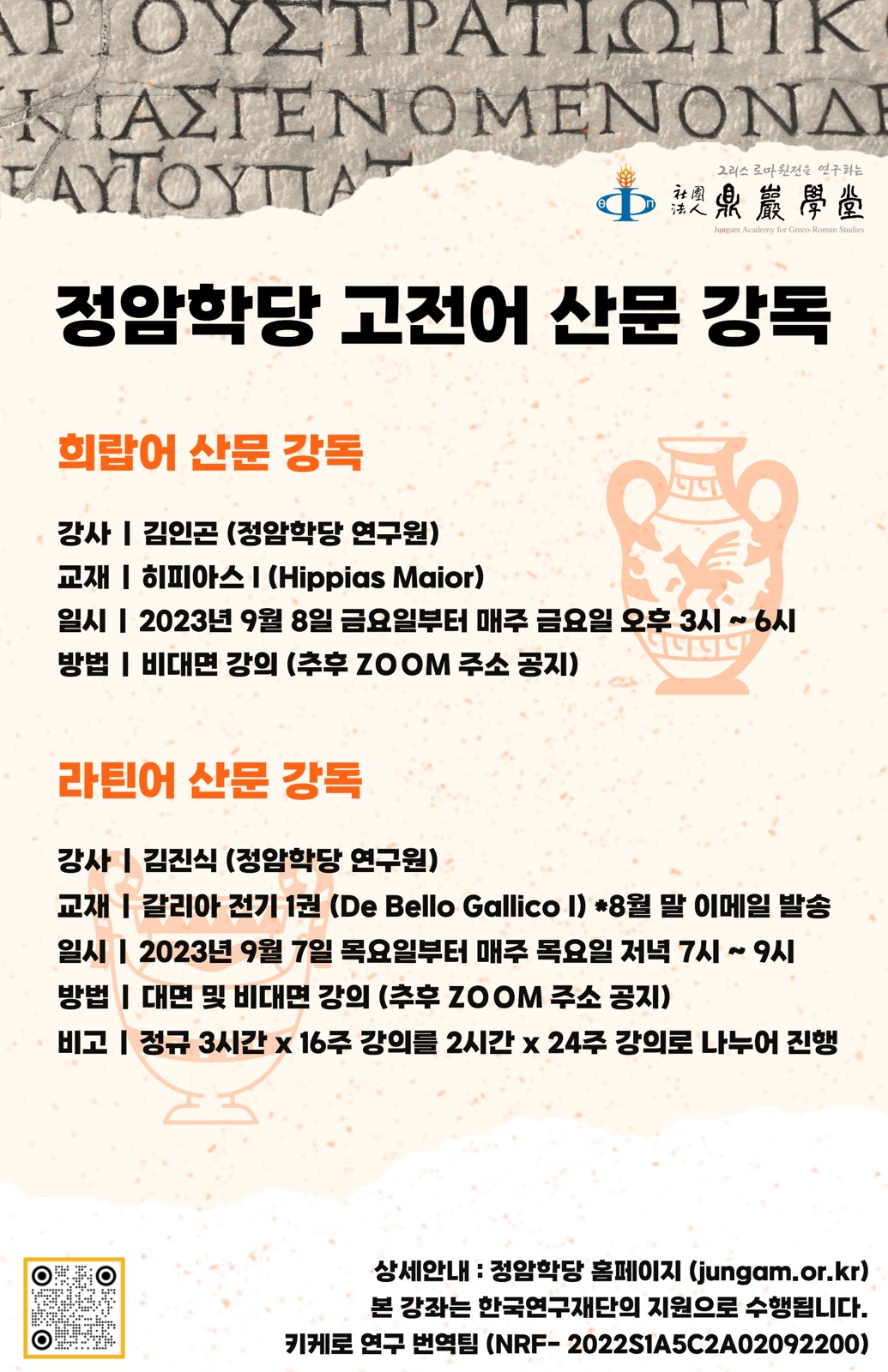 그리스, 로마 고전 연구 기관인 정암학당에서 마련한 고전어 강좌 소식을 우리 학회 회원님께도 공유해 드리고자 합니다.