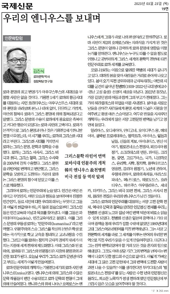 "우리의 엔니우스를 보내며" (故 천병희 선생님 추모글) - 김진식 선생님